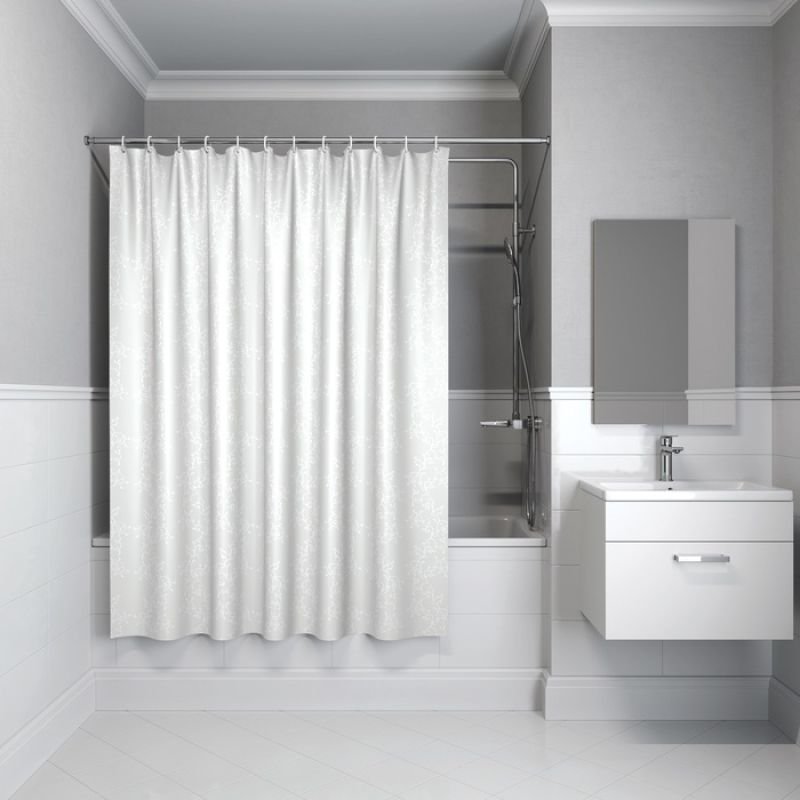 Текстильная штора для ванной белого цвета с ненавязчивым узором гармонично впишется в классический и современный интерьер.
