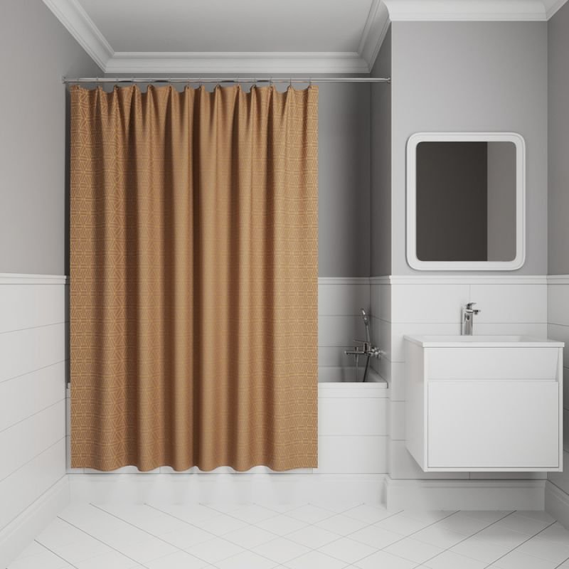 Текстильная штора теплого карамельного оттенка с геометричным золотым узором создаст утонченное элегантное настроение даже в самом простом интерьере.