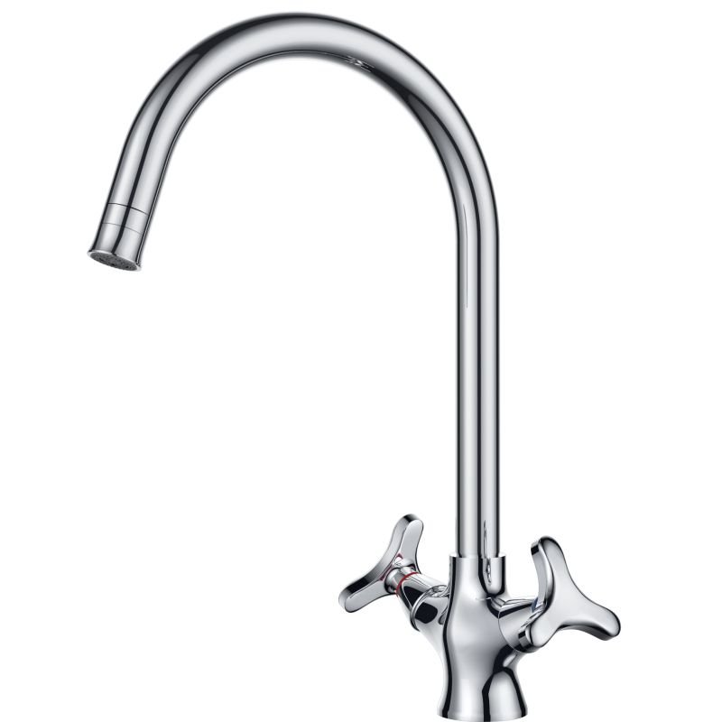 Блестящий внешний вид двухручкового смесителя с обновленными ручками привлекает своим внешним видом, послужит прекрасным дополнением классической кухни.