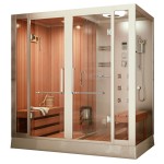 Если Вы хотите организовать настоящую сауну в своем доме, лучший вариант — это душевая кабина, совмещённая с финской сауной от производителя Frank. Она объединяет как обычную душевую кабину, так и сауну. В общем боксе находятся сразу два отделения: одно с душем, другое — с финской сауной. Между отделениями есть дверь, через которую можно пройти, непосредственно, во время процедур.