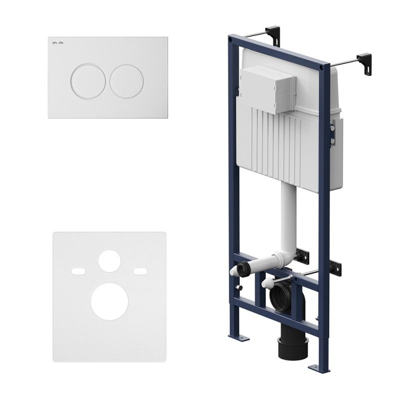 Максимально полная комплектация - все необходимые крепления патрубки звукоизолирующая прокладка в комплекте. Вертикальные ребра жесткости в конструкции рамы – дополнительная опора в месте давления керамики на стену. Экономия пространства благодаря узкому бачку – 120 мм глубиной. Заливной клапан с низким уровнем шума - Класс II согласно европе...