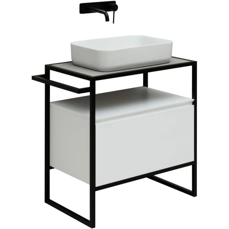 Стильные каркасы тумб и пеналов выполнены из металла, имеют брашированную поверхность с нанесением цвета путем анодирования.