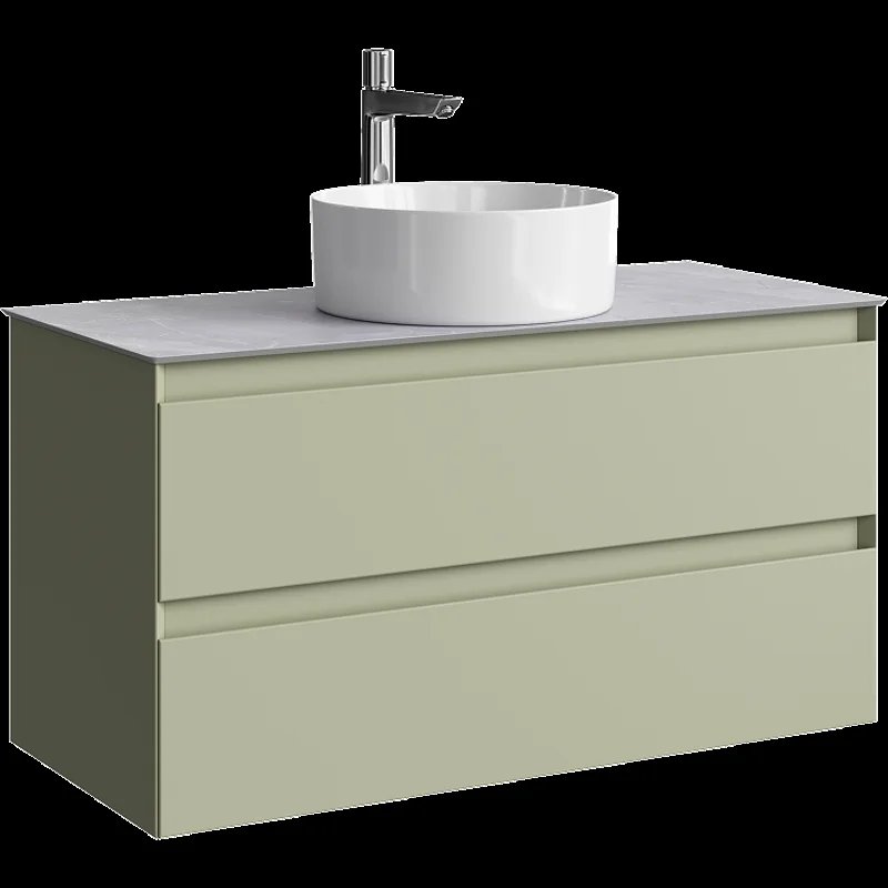 Подвесная тумба с накладным умывальником Aqwella Geometria 100см, с двумя ящиками, цвет зеленый шалфей, со столешницей серый камень