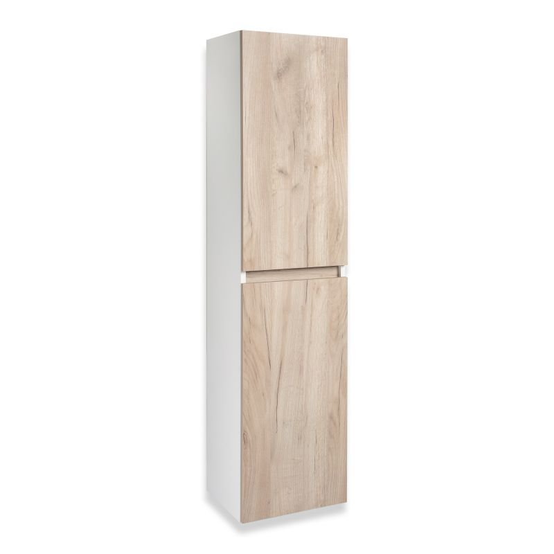 Шкаф пенал для ванной комнаты RUNO Бари (подвесной) - безупречное сочетание модных тенденций с классическим оформлением ванной комнаты. Шкаф в ванную комнату оснащён двумя распашными дверцами, в нижнем и верхнем отделениях по одной встроенной полке. Цвет корпуса классический - белый, при этом цвет фасада в модном цвете – крафтовый дуб, идеально ...