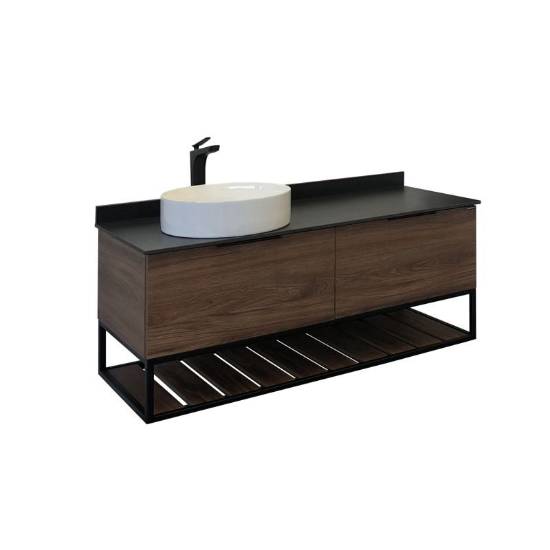 Подвесная Тумба с раковиной с двумя выкатными ящиками с плавным закрыванием, столешницей из черного керамогранита и с одной кругл...