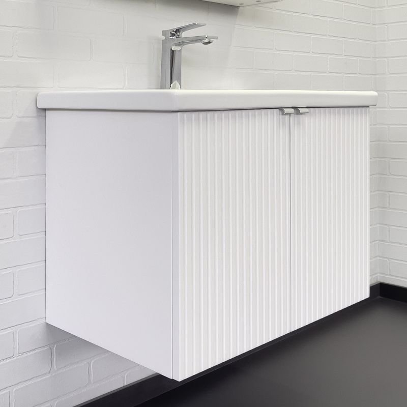 Подвесная Тумба с раковиной с двумя распашными створками декорированными вертикальной фрезеровкой. Створки оснащ...