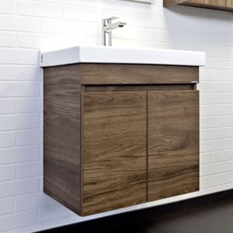 Подвесная Тумба с раковиной с двумя распашными дверцами. Створки оборудованы петлями с механизмами плавного закрывания. Фасад и корпус тумбы изготовлены из влагостойкого ДСП, созданного по уникальной технологии «Синхронное тиснение» в декоре «дуб темно-коричневый». Этот декор при прикосновении дарит ощущение натуральной древесины.