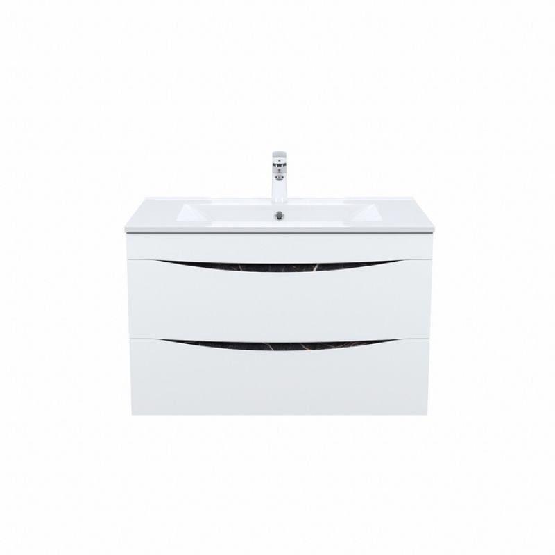 Стильная подвесная тумба Cloud из влагостойкой ЛДСП, где гармонично сочетаются боковины под черный мрамор, матовые белые фасады с интегрированными ручками и тонкий умывальник. Обновление популярной коллекции мебели Cloud и украшение современной ванной.