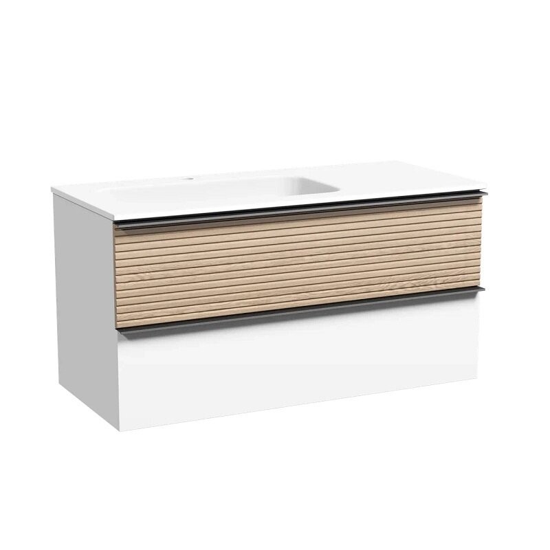 Тумба подвесная SANCOS Delta 995х445х500, c двумя ящиками оснащенными доводчиками скрытого монтажа с системой Soft close (плавного закрывания), ручки чёрные профильные накладные, левая, дуб светлый/белый , арт. DL100LW