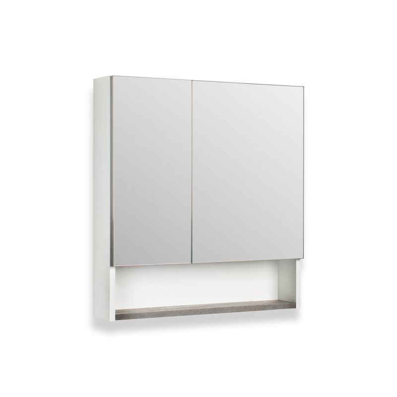 Зеркальный шкаф для ванной RUNO Бари - имеет презентабельный и необычный внешний вид, корпус зеркального шкафа классический белый, но при этом нижняя открытая полка выполнена в контрастном цвете – железный камень. Подойдет для установки как в квартире, так и на даче. Шкаф зеркало для ванной отлично впишется в любой интерьер ванной комнаты. Шкафч...