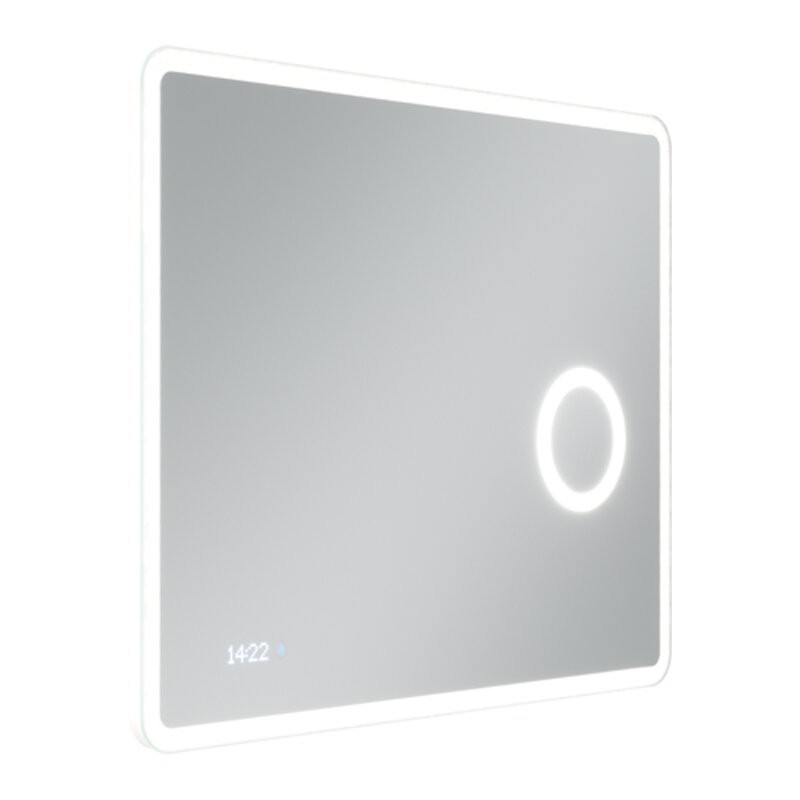 Зеркало для ванной комнаты SANCOS Arcadia 1.0 90х70, LED подсветка; диммируемый сенсорный выключатель; встроенное увеличительное зеркало (линза) с 3-х кратным увеличением, дополнительная подсветка вокруг линзы; встроенные часы,пластиковый светопропускающий короб, арт.AR1.90