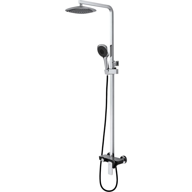 Функциональная душевая система в изысканном черном цвете с широкой лейкой, с эффектом настоящего тропического ливня. Штанга регулируется под любой рост.