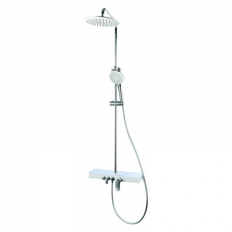 Смеситель для ванны с верхним душем и полкой (материал полки - оргстекло), цвет белый/хром, керамический картридж Softap 35 мм, поворотный излив на шарнирном креплении, силиконовый аэратор Neoperl; верхняя лейка - 1 режим, диаметр 260мм, ABS-пластик; ручная лейка - 3 режима, диаметр 115 мм, ABS-пластик; держатель для ручной лейки - ABS-пластик; ...