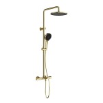 Душевая стойка с термостатом и изливом SANCOS Etna, ...Душевая стойка с изливом и встроенным термостатом; Термостат со высокочувствительным катриджем SEDAL (Испания) мгновенно настраивает желаемую температуру воды; Предустановленный ограничитель температуры при 40°; Система защиты от ожогов при отключении холодной воды; Встроенный клапан защиты от обратного потока: Установленный на изливе переключатель между источниками воды; Возможность регулировки штанги по высоте; Верхний душ 250 мм с возможностью настройки наклона; Ручной душ пластик, 3 режимай; Гибкий шланг с системой защиты от перекручивания - 1,5 м , материал - пластик; Цвет брашированное золото