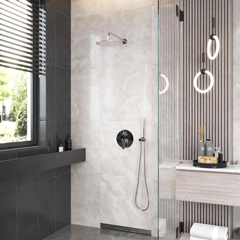 Душевой комплект BERGES VENTAS 2R - встраиваемый душевой комплект обладает двухрежимной системой и состоит из верхней лейки - «тропического ливня», ручного душа и смесителя. Лейка верхнего душа имеет инновационную систему самоочистки в виде гибких силиконовых вставок на форсунках душа, которые защищают изделие от известковых отложений. Изготовле...
