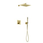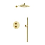Душевой комплект с термостатом SANCOS Linn, с внутре...Комплект для душа с термостатом; Надежный корпус из высококачественной латуни; Термостат со высокочувствительным катриджем SEDAL (Испания) мгновенно настраивает желаемую температуру воды; Предустановленный ограничитель температуры при 40°; Система защиты от ожогов при отключении холодной воды; Встроенный клапан защиты от обратного потока:; Встроенный девиатор автоматически переключает поток с верхнего душа на ручной при выключении воды. Кнопочное управление режимами верхнего душа и источниками воды. Ручной душ из латуни со шлангом из ПВХ с системой защиты от перекручивания, длина 1,5 м. Верхний душ из нержавеюшей стали; Верхний душ - 2 режима (каскадный и тропический); Экстра прочное покрытие PVD; цвет брашированное золото
