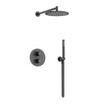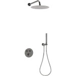 Душевой комплект с термостатом SANCOS Etna, с внутре...Смеситель со встроенным термостатом; Надежный корпус из высококачественной латуни; Термостатический картридж SEDAL (Испания) - обеспечивает точную настройку заданной температуры; Встроенный девиатор SEDAL (ИСпания) автоматически переклюключает поток с верхнего душа на ручной при выключении воды. Ручной душ из латуни; Шланг ПВХ с системой защиты от перекручивания, длина 1,5 м; Верхний душ из нержавеюшей стали , Ø250 мм, с возможностью регулировки угла наклона; прочное покртытие методом электроплейтинга; цвет матовый черный ; экстрапрочное PVD покрытие; Цвет вороненая сталь