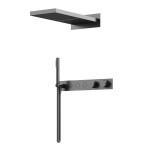 Душевой комплект с термостатом SANCOS Linn, с внутре...Смеситель со встроенным термостатом; Надежный корпус из высококачественной латуни; Термостатический картридж SEDAL (Испания) - обеспечивает точную настройку заданной температуры; Встроенный девиатор автоматически переклюключает поток с верхнего душа на ручной при выключении воды. Ручной душ из латуни со шлангом из ПВХ с системой защиты от перекручивания, длина 1,5 м. Верхний душ из нержавеюшей стали; Верхний душ 250x250 с возможностью регулировки угла наклона; прочное покрытие методом электроплейтинга: цвет вороненая сталь