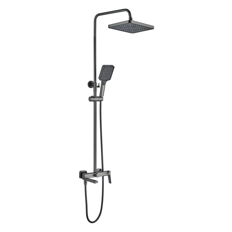 Душевая система Shevanik S9936T, оружейная сталь. Количество режимов струи: 3. Размер верхнего душа: 32x21 см. Управление: рычажное. Излив для наполнения ванны: да.