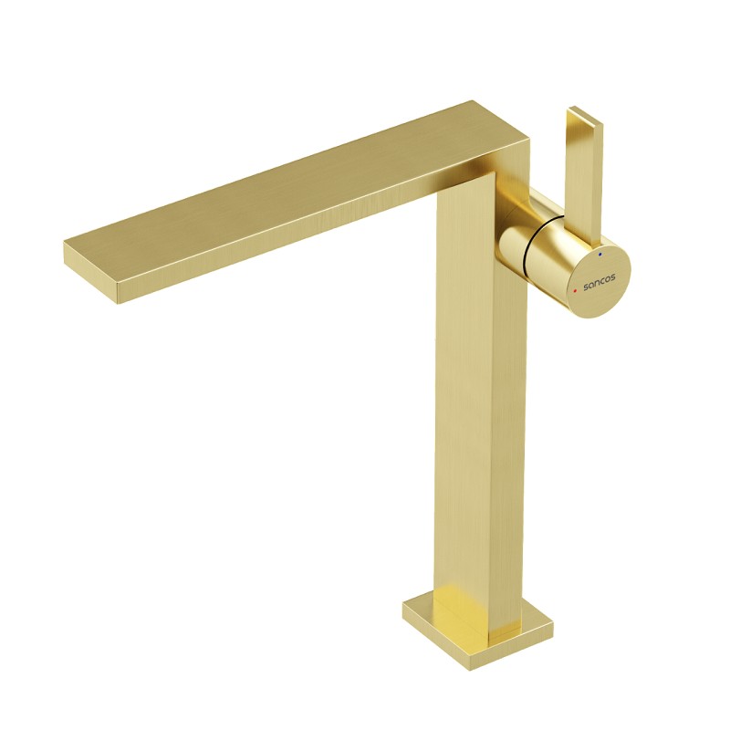 Смеситель для раковины высокий SANCOS Linn, брашированное золото, PVD покрытие, арт. SC9020BG