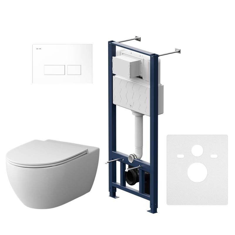 Полностью готовый к установке комплект: система инсталляции с клавишей подвесной унитаз с сиденьем. Неразборная рама из стального профиля выдерживает нагрузку до 400 кг. Полностью изолированный бачок с качественной двухрежимной смывной арматурой укомплектован пневматической клавишей в цвете белый.