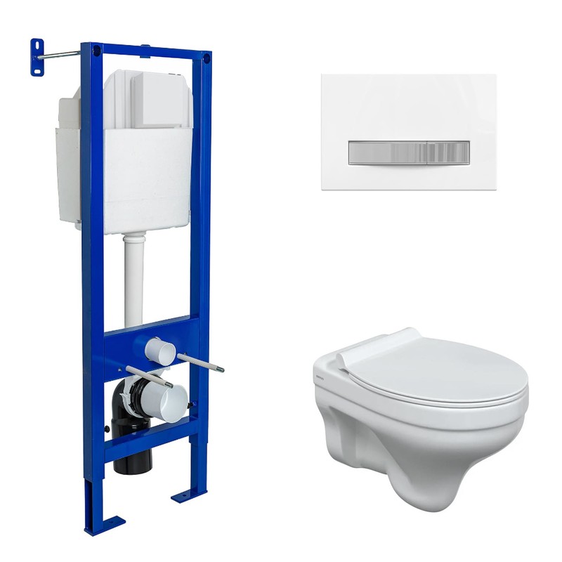 Комплект BERGES: инсталляция ATOM 410 кнопка Atom Line хром/белая, унитаз ALBIT S, сиденье дюропласт Top Slim SO