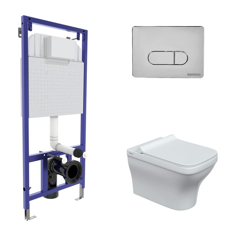 Комплект BERGES: инсталляция NOVUM кнопка D3 хром глянец, унитаз Strati Rimless, сиденье дюропласт Strati Slim SO