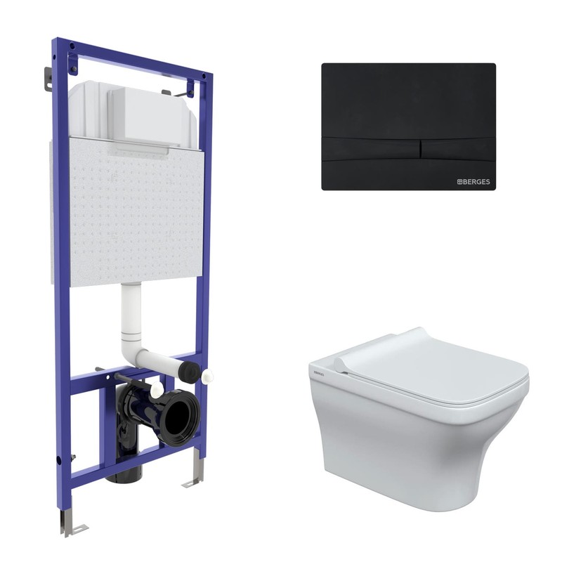 Полный Комплект BERGES для монтажа подвесного унитаза: инсталляция NOVUM525: толщина бачка 80 мм, резервуар воды объемом 10 литров с тепло-шумоизоляцией, объем смыва 3/6 литра с возможностью регулировки, нагрузка 400 кг, антикоррозийное покрытие, кнопка F5 черная Soft Touch, пластик, унитаз STRATI: Безободковый смыв, сиденье дюропласт STRATI ...