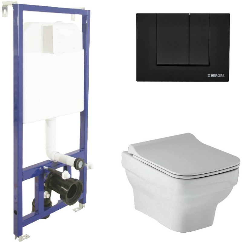 Комплект BERGES для монтажа подвесного унитаза: инсталляция NOVUM525, кнопка S5 Soft Touch черная, унитаз LEVEL Rimless, сиденье дюропласт Level Slim SO, микролифт, быстросъем