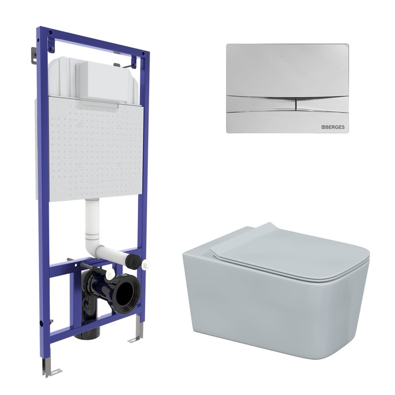 Комплект BERGES для монтажа подвесного унитаза: инсталляция NOVUM525, кнопка F3 хром глянец, унитаз FLOE Rimless, сиденье дюропласт Floe Slim SO, микролифт, быстросъем
