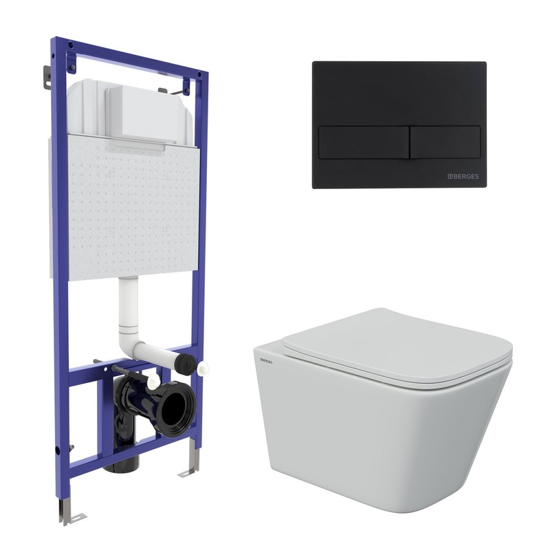 Комплект BERGES для монтажа подвесного унитаза: инсталляция NOVUM525, кнопка L5 черная Soft Touch, унитаз FLOE S Rimless, сиденье дюропласт Floe S Slim SO, микролифт, быстросъем