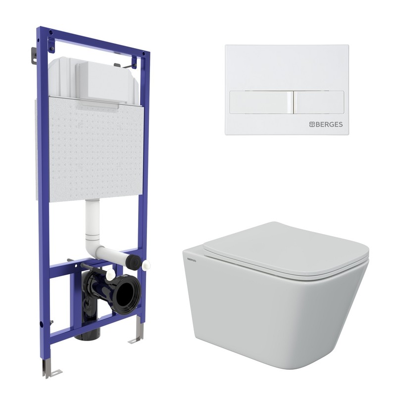 Комплект BERGES для монтажа подвесного унитаза: инсталляция NOVUM525, кнопка L1 белая, унитаз FLOE S Rimless, сиденье дюропласт Floe S Slim SO, микролифт, быстросъем