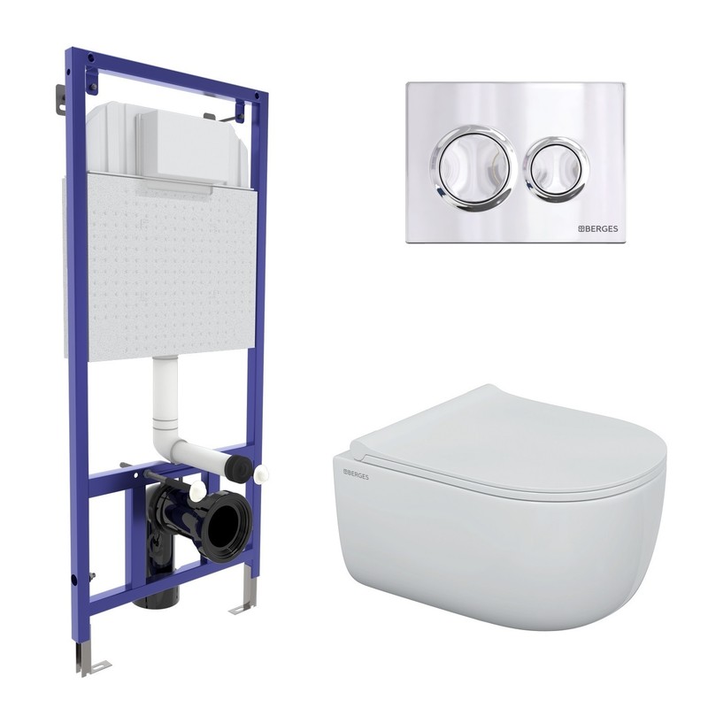 Комплект BERGES для монтажа подвесного унитаза: инсталляция NOVUM525, кнопка O3 хром глянец, унитаз EGO Rimless, сиденье дюропласт Okus Slim SO, микролифт, быстросъем