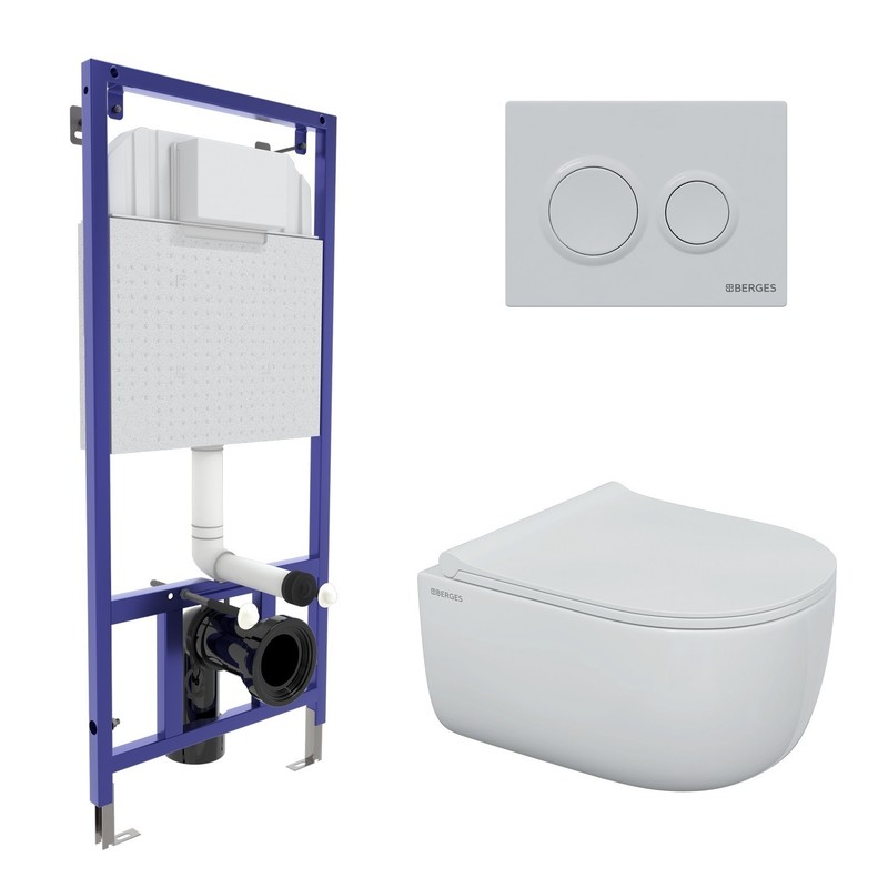 Комплект BERGES для монтажа подвесного унитаза: инсталляция NOVUM525, кнопка O1 белая, унитаз EGO Rimless, сиденье дюропласт Okus Slim SO, микролифт, быстросъем