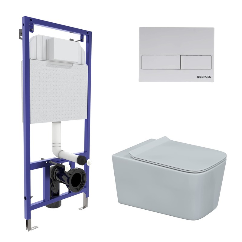 Комплект BERGES для монтажа подвесного унитаза: инсталляция NOVUM525, кнопка L4 Soft Touch белая, унитаз FLOE, сиденье дюропласт FLOE Slim SO