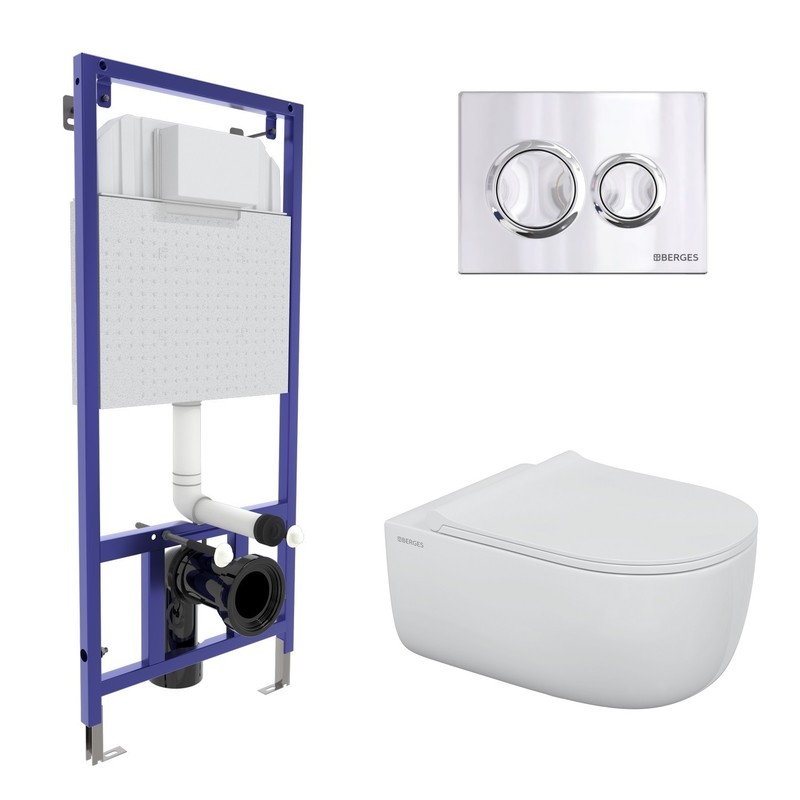Комплект BERGES для монтажа подвесного унитаза: инсталляция NOVUM525, кнопка O3 хром глянец, унитаз EGO XL Rimless, сиденье дюропласт Okus Slim SO, микролифт, быстросъем