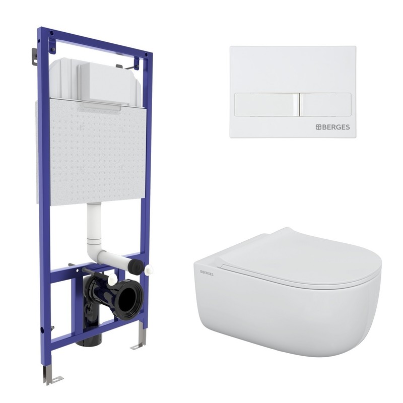 Комплект BERGES для монтажа подвесного унитаза: инсталляция NOVUM525, кнопка L1 белая, унитаз EGO XL Rimless, сиденье дюропласт Okus Slim SO, микролифт, быстросъем