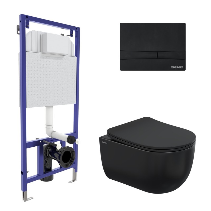 Комплект BERGES для монтажа подвесного унитаза: инсталляция NOVUM525, кнопка F5 soft touch черный, унитаз Ventas Black, сиденье дюропласт микролифт, быстросъем