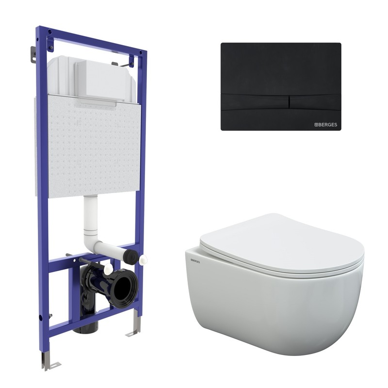 Комплект BERGES: инсталляция NOVUM кнопка F5 Soft Touch черная, унитаз VENTAS Rimless 49 см, сидение дюропласт Ventas Slim SO, микролифт, быстросъём