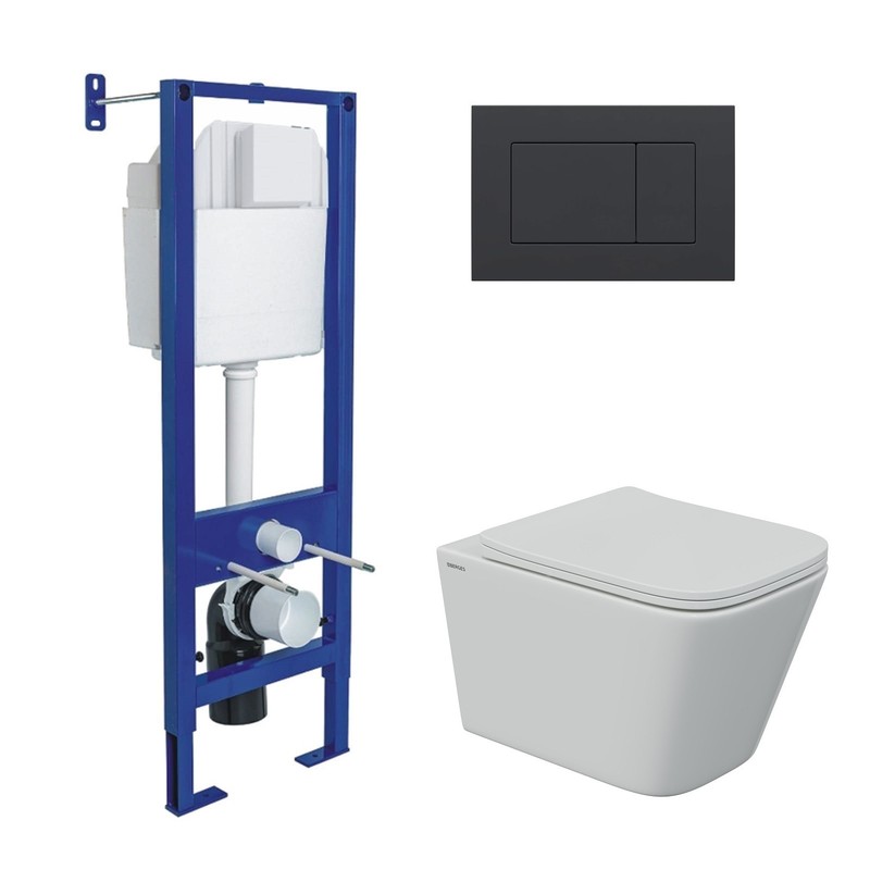 Комплект BERGES: инсталляция АТОМ 410 кнопка Atom черная Soft Touch, унитаз FLOE S Rimless 51 см, сидение дюропласт Floe S Slim SO, микролифт, быстросъём