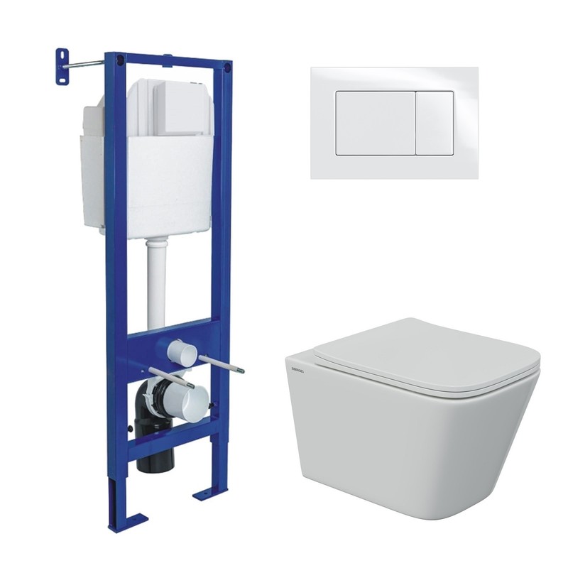 Комплект BERGES: инсталляция АТОМ 410 кнопка Atom белая, унитаз FLOE S Rimless 51 см, сидение дюропласт Floe S Slim SO, микролифт, быстросъём
