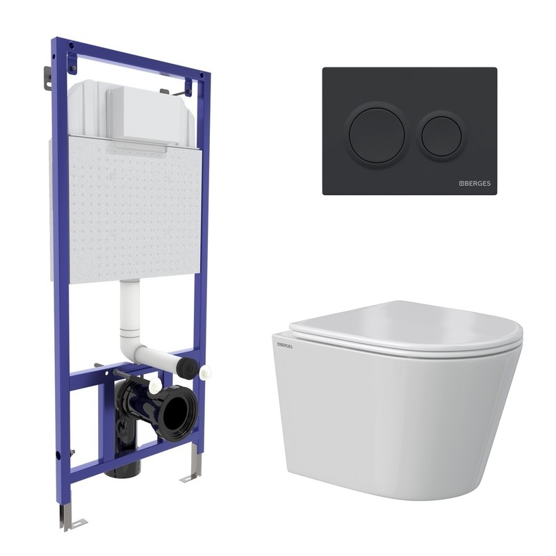 Комплект BERGES: инсталляция NOVUM кнопка O5 Soft Touch черная, унитаз VITA Rimless 49 см, сиденье дюропласт микролифт, быстросъём