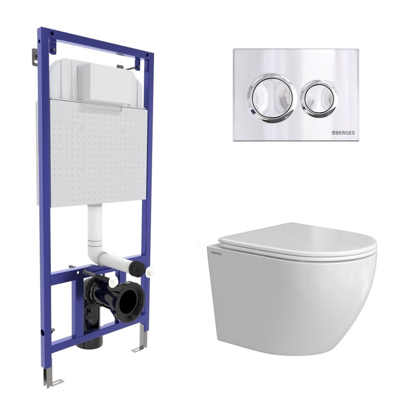 Комплект BERGES: инсталляция NOVUM кнопка O3 хром глянец, унитаз OKUS Rimless 49 см, сиденье дюропласт микролифт, быстросъём