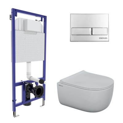 Комплект BERGES для монтажа подвесного унитаза: инсталляция NOVUM525, кнопка L3 хром глянец, унитаз EGO Rimless, сиденье дюропласт Toma Slim SO, микролифт, быстросъем
