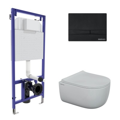 Комплект BERGES для монтажа подвесного унитаза: инсталляция NOVUM525, кнопка F5 черная Soft Touch, унитаз EGO Rimless, сиденье дюропласт Toma Slim SO микролифт, быстросъем
