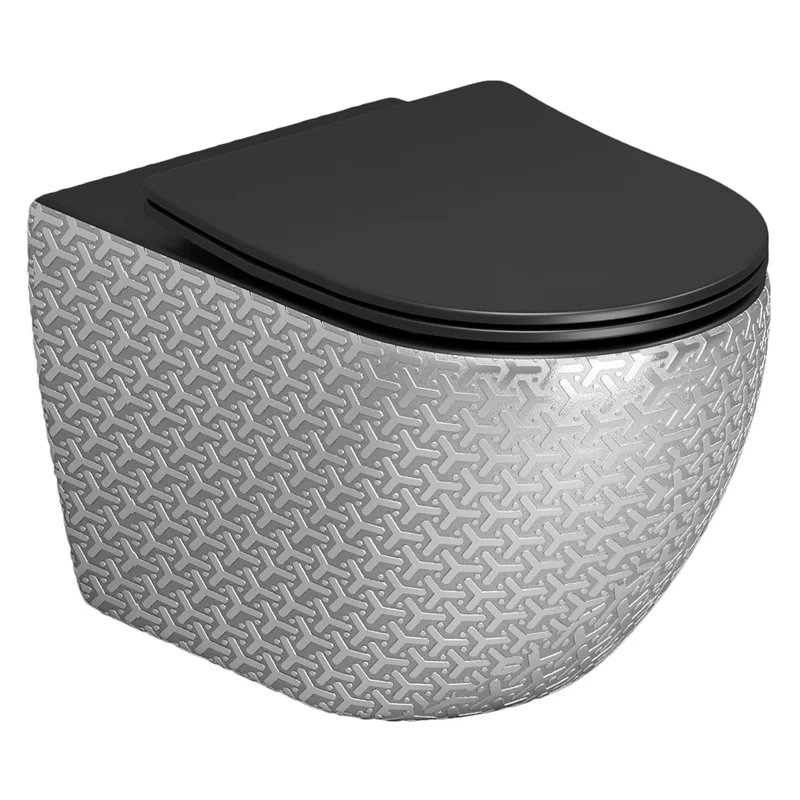 Унитаз GR-4411SBRS (550*360*375) СЕРЕБРО внутри ЧЕРНЫЙ подвесной БЕЗОБОДКОВЫЙ с тонкой крышкой